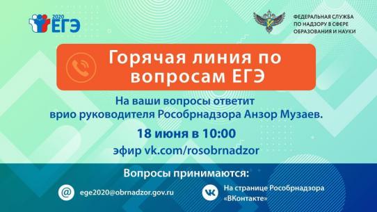 Горячая линия, посвященная проведению государственной итоговой аттестации в 2020 году, пройдет в Ситуационно-информационном центре Федеральной службы по надзору в сфере образования и науки 18 июня в 10:00. Ее трансляция будет вестись в прямом эфире в сообществе Рособрнадзора в социальной сети «ВКонтакте».